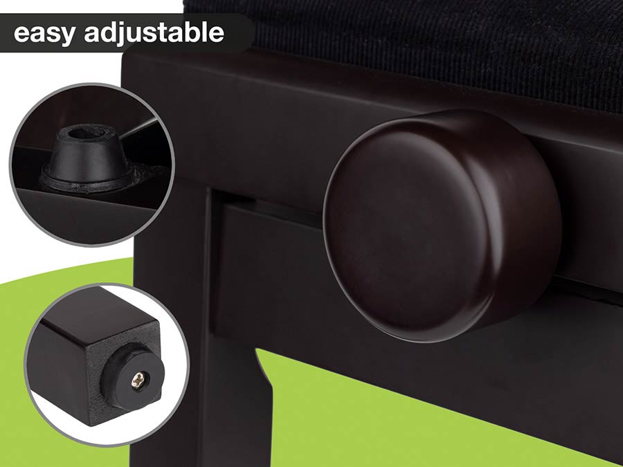 Dat een goede zithouding en de juiste hoogte van een pianobank essentieel is voor uw pianospel weet iedereen wel. Deze rosewood satijnen Boston pianobank is een comfortabele bank met een stevige zitting. Deze bank is d.m.v. 2 design draaiknoppen eenvoudig in hoogte te verstellen , de laagste stand is 48 cm en de hoogst 56 cm. Het formaat van de zwarte velours zitting is 55,5 cm x 32,5 cm