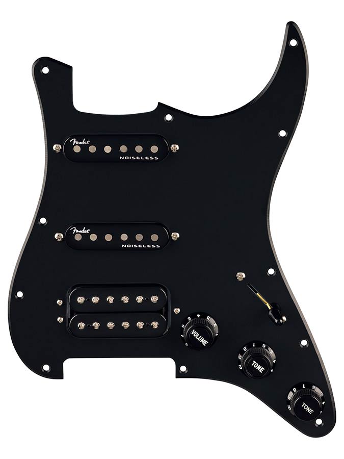 pre-wired Strat pickguard, quadra tap/ultra noiseless HSS, 11 hole, black
