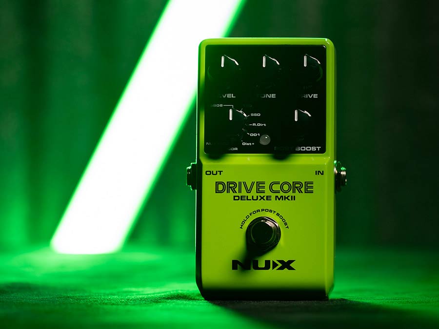 The NUX NCO-2 Drive Core Deluxe MKII is a versatile analog overdrive pedal offering eight classic drive tones in a single, compact unit. From smooth Texas blues to rich Nashville grit, each mode is easily selected via the digital rotary knob. Its 100% analog circuitry ensures warm and responsive tone, while the built-in post boost, activated by holding the footswitch, adds up to 7dB of volume for solos or punchier passages. Whether used as a subtle boost or your main overdrive, the Drive Core Deluxe MKII adapts seamlessly to any setup.