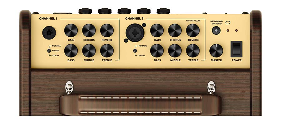 Deze kanalen in combinatie met een AUX in, effect send/return, line out, DI out en footswitch inputs maakt het een complete oplossing voor het versterken van je akoestische optreden of opname. Wat betreft footswitch heb je de keuze om er de looper/rythme mee te triggeren of de chorus/reverb op kanaal 1. Alles is zo ontworpen dat deze amp prettig en naar wens zal werken door dit soort keuzes in functies.