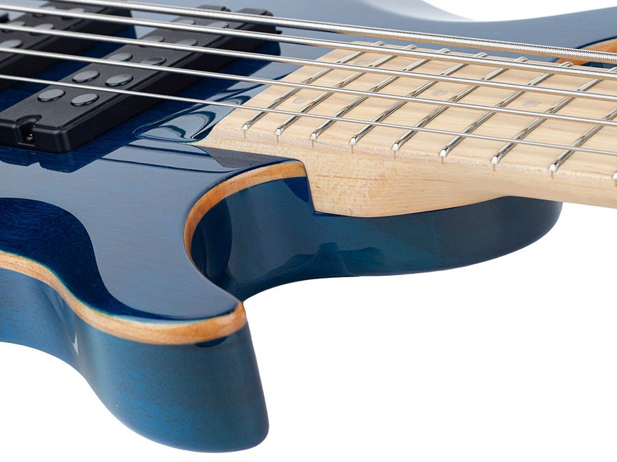 basgitaar, 5-snarig, mahonie, transparant blauw